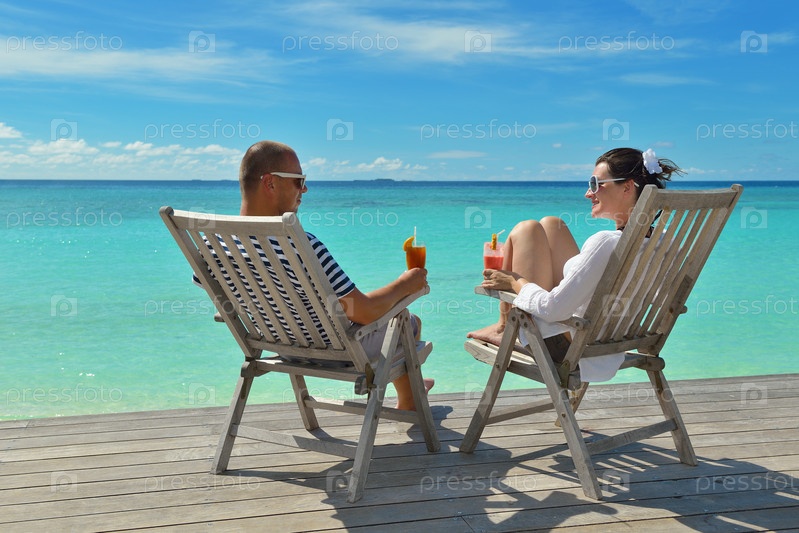 Счастливая молодая пара отдыхает и пьет прохладительные напитки