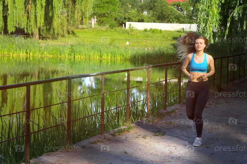 Девушка бежит по берегу реки