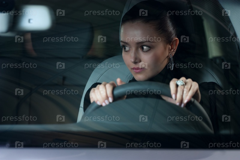Молодая женщина за рулем автомобиля, смотрящая в сторону