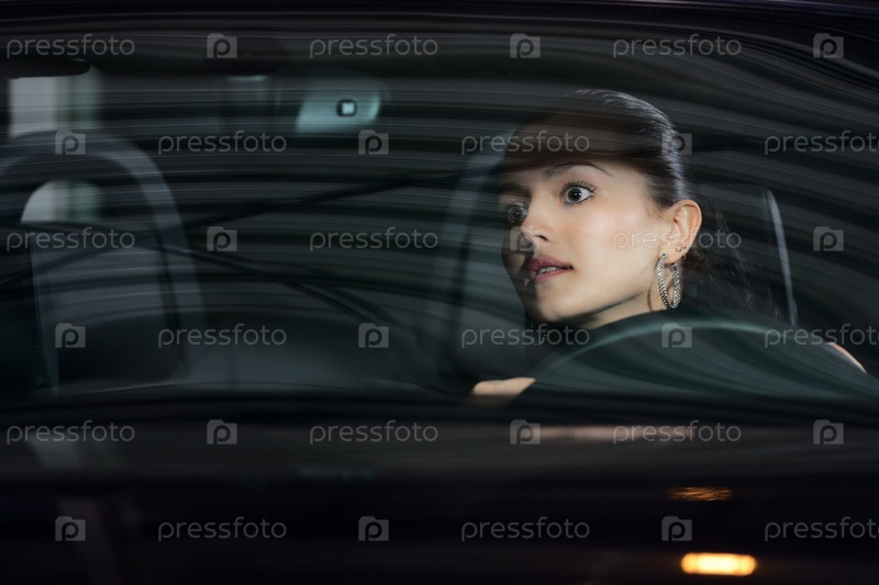 Молодая женщина за рулем автомобиля, смотрящая в зеркало заднего вида