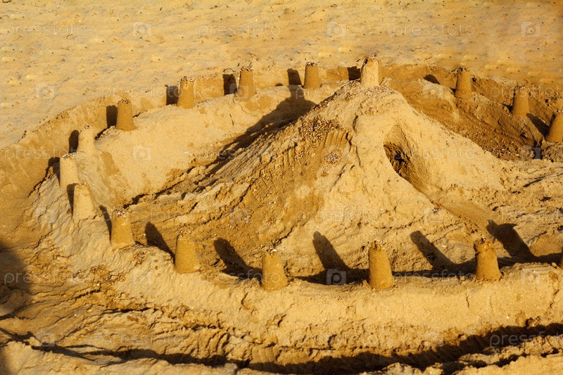 Замок и крепостная стена, построенные детьми из песка на пляже