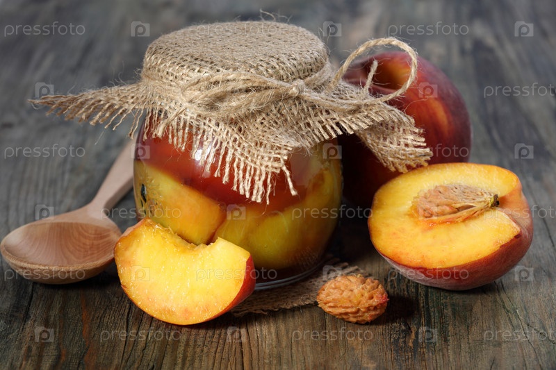 Персики и банка с вареньем крупным планом