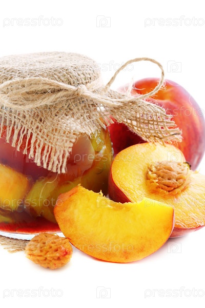 Персики и банка с вареньем крупным планом