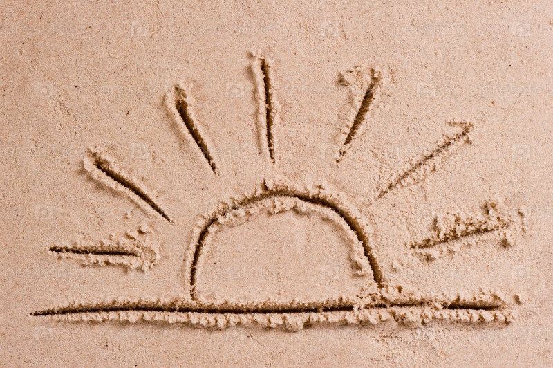 Солнце садится за горизонт. Рисунок на морском песке