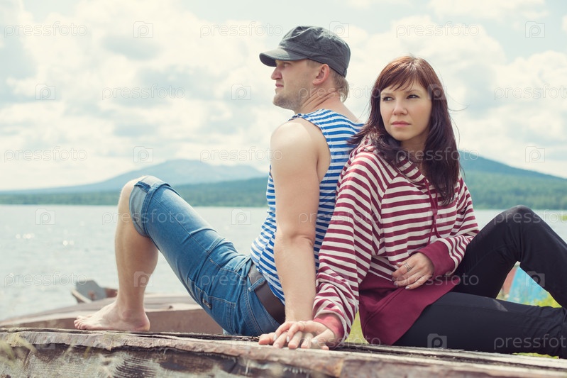 Романтичная пара отдыхает на берегу горного озера летом
