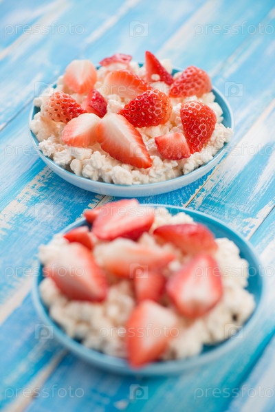 Творог с нарезанной клубникой в двух блюдцах