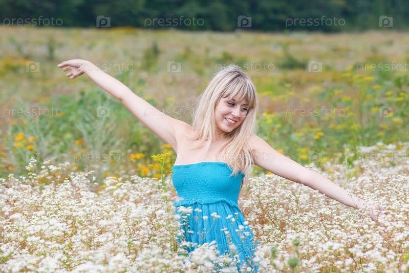 Девушка стоит на цветущем поле