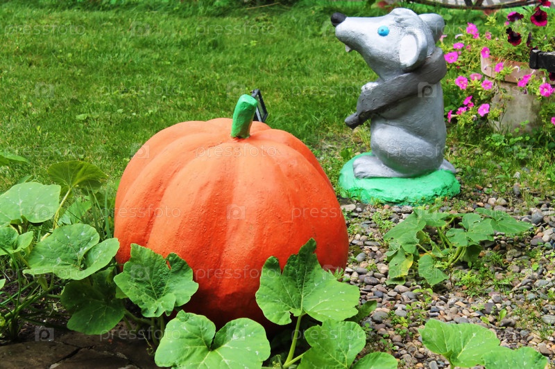 Игрушечные мышка и тыква на лужайке