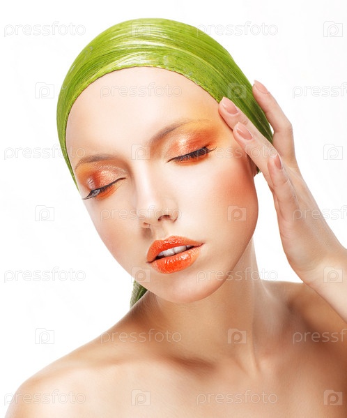 Харизма. Красивая женщина в светло-зеленом платке. Творческий глянцевый макияж