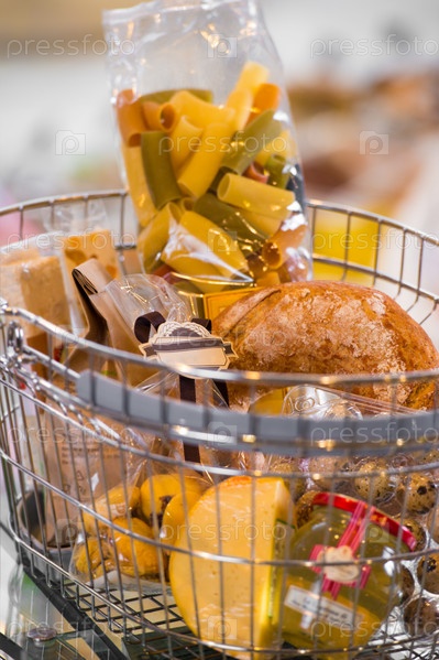 Продуктовый магазин. Корзина в супермаркете, полная различных продуктов