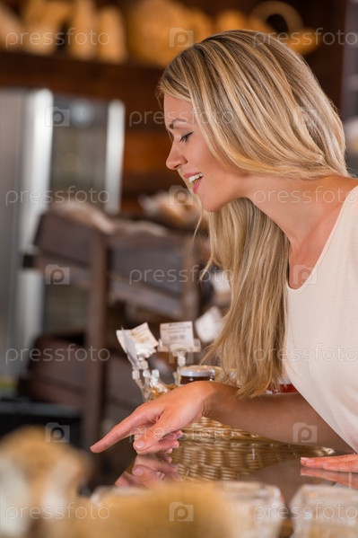 Радостная молодая женщина в хлебном магазине