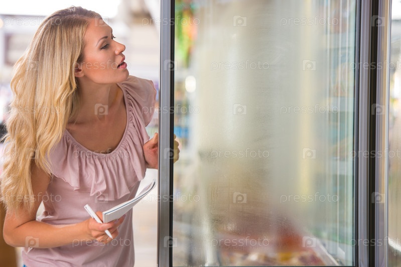 Молодая женщина делает покупки в супермаркете