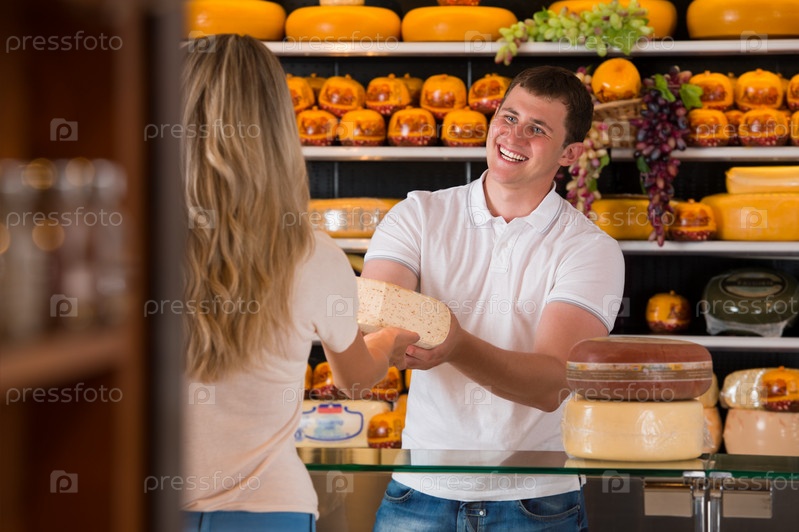 Клиентка и продавец в сырном магазине