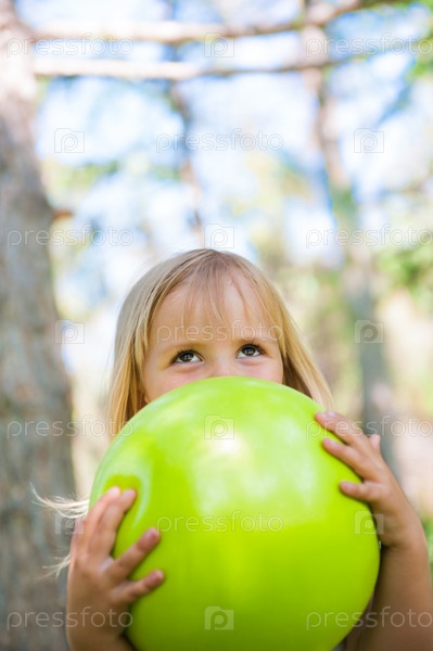 Девочка играет с зеленым мячом в парке