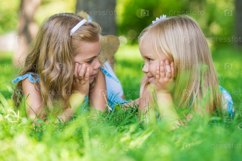 Счастливые дети отдыхают на зеленой траве в летнем парке
