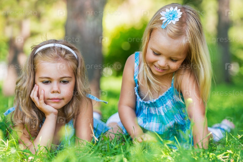 Счастливые дети отдыхают на зеленой траве в летнем парке