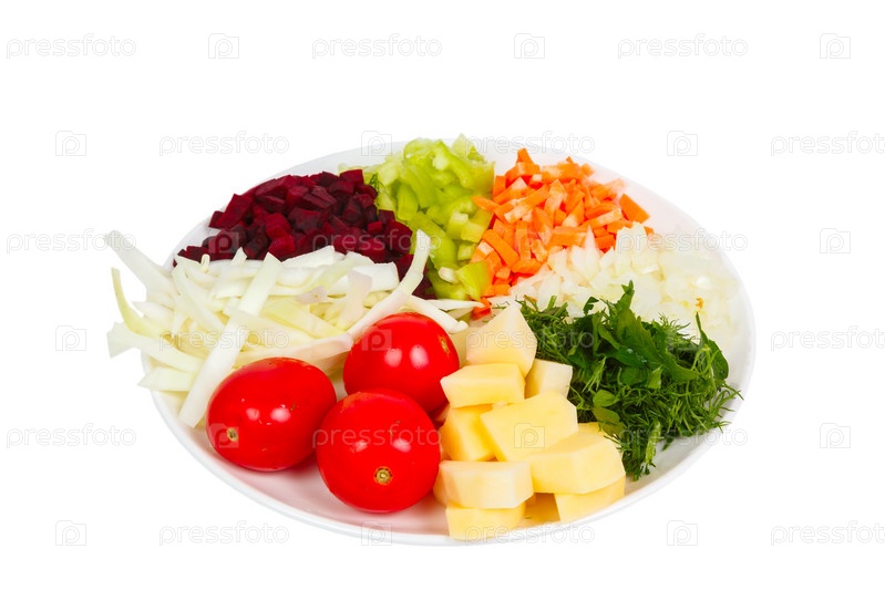 Нарезанные овощи на тарелке, изолированные