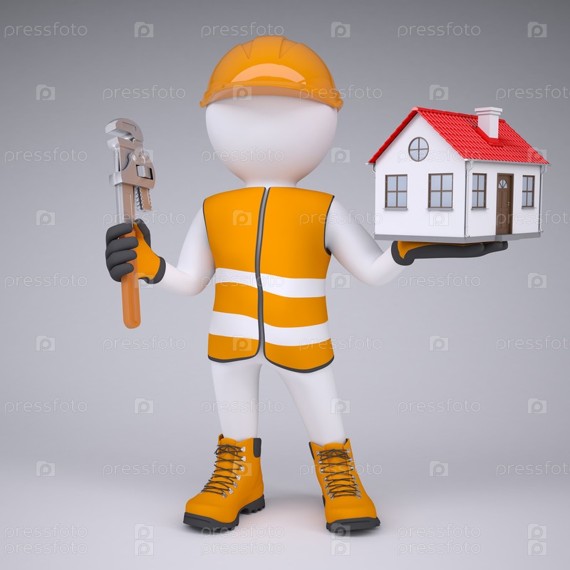 3D человек в спецодежде с ключом и домом