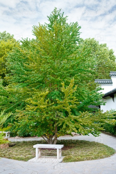 Осенний парк с каменными скамьями и тротуарами