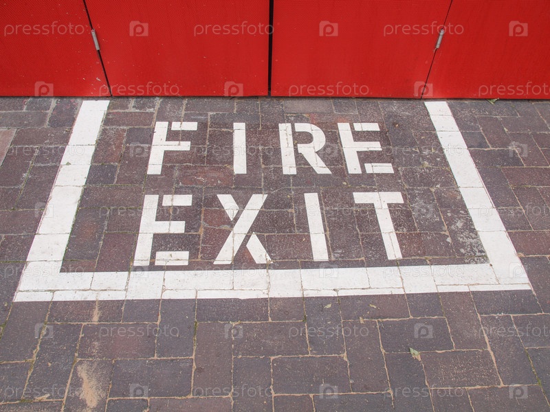 Знак пожарного выхода на тротуаре перед дверью