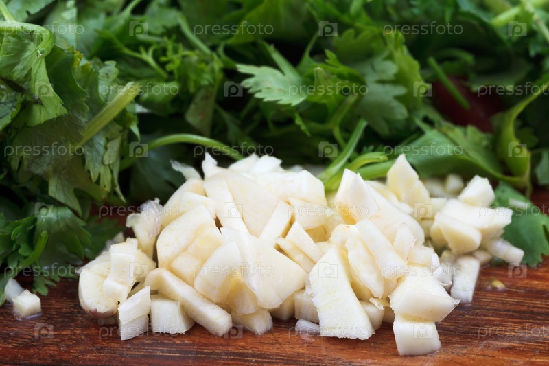 Нарезанный чеснок, зелень петрушки и кинзы