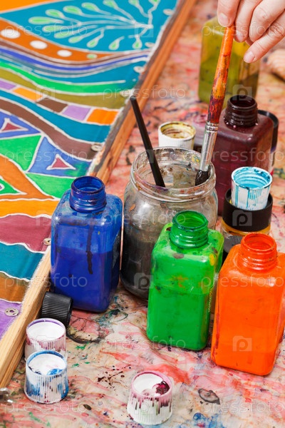 Кисти и бутылки с цветными пигментами