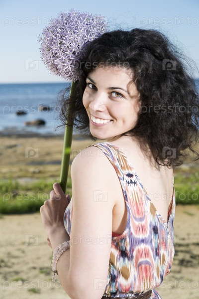 Улыбающиеся женщина с темными волосами с цветком