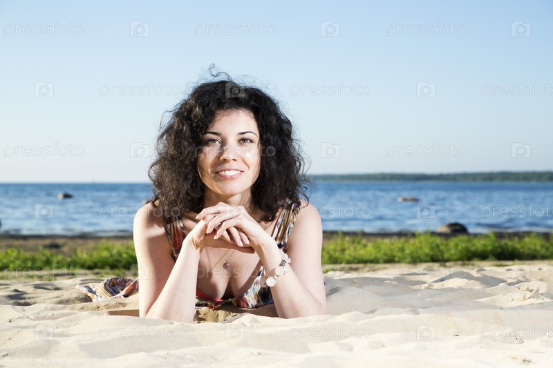 Счастливая женщина лежит на пляже