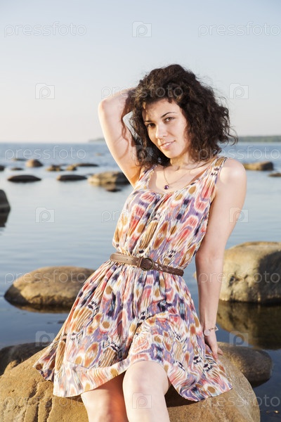 Женщина с темными волосами позирует на камне