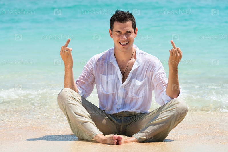 Мужчина показывает средний палец на пляжа