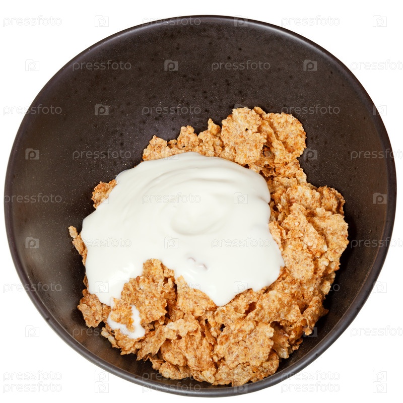 Миска хлопьев с йогуртом. вид сверху