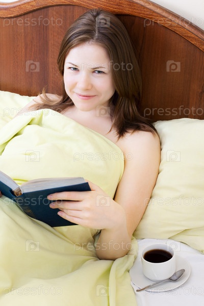 Молодая девушка с книгой и чашкой кофе, лежащая в постели