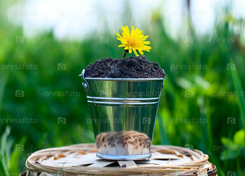 Ведерко с одуванчиками на фоне травы