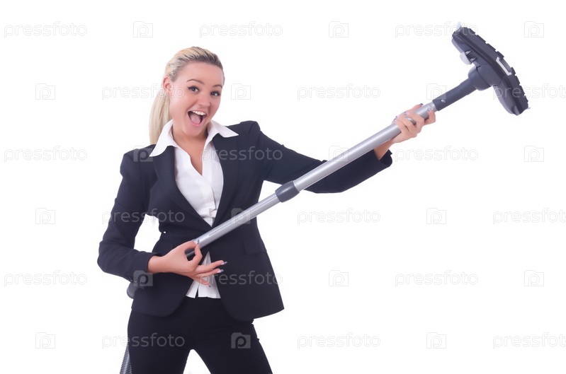 Бизнес-леди с пылесосом на белом фоне