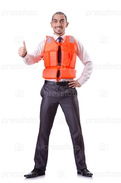 Бизнесмен в спасательном жилете на белом фоне