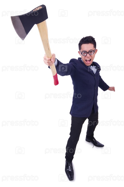 Забавный человек с топором на белом фоне