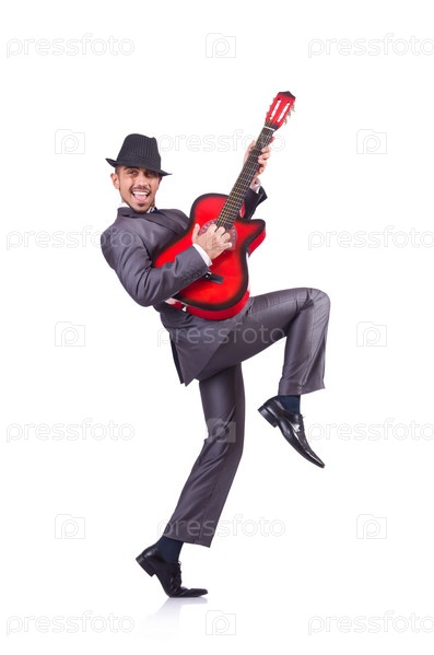 Бизнесмен играетн а гитаре, изолированный на белом