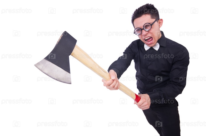 Забавный человек с топором на белом фоне