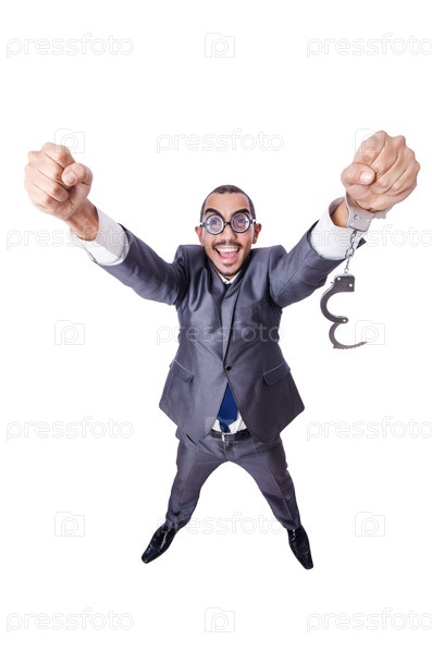 Смешной бизнесмен с наручниками на белом фоне