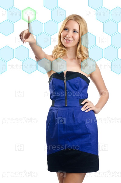 Женщина нажимает на виртуальные кнопки на белом фоне