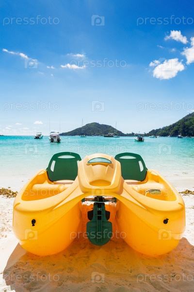 Желтый водный велосипед на пляже с потрясающим видом на океан и холмы