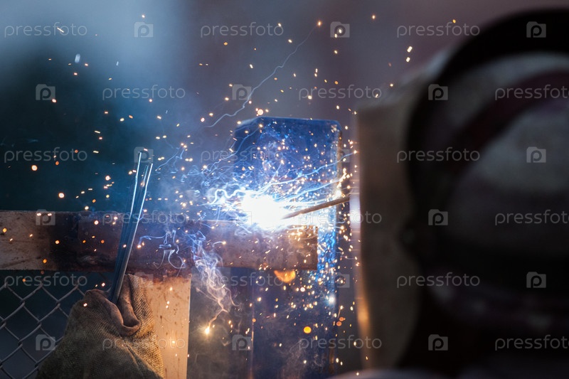Электросварщик в защитной маске сваривает металлоконструкцию