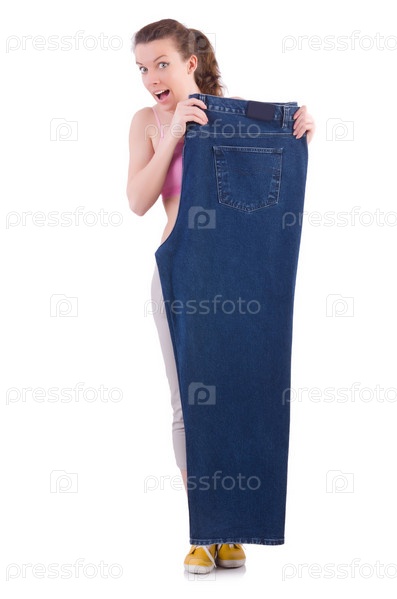 Женщина с большими джинсами в концепции диеты