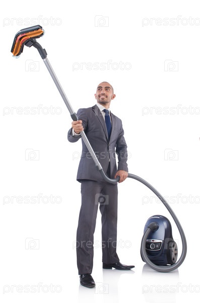 Бизнесмен пылесосит на белом фоне