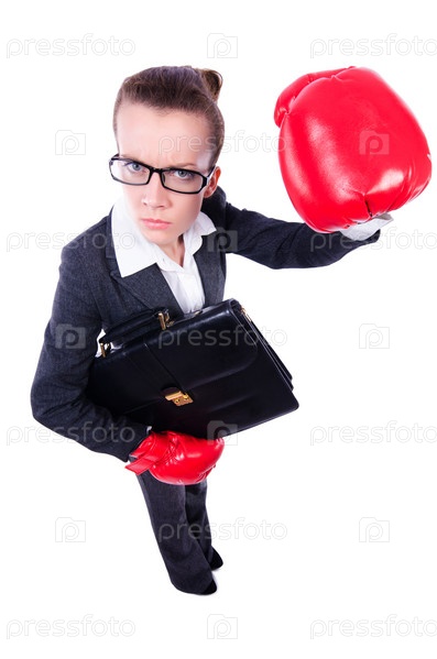 Женщина в боксерских перчатках на белом фоне