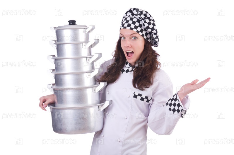 Повар со стопкой кастрюль на белом фоне