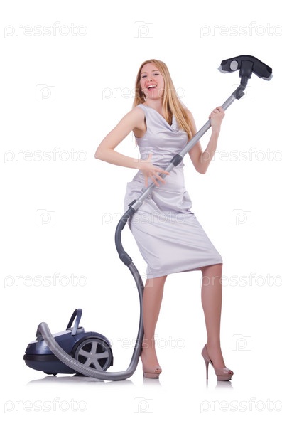Молодая женщина с пылесосом на белом фоне