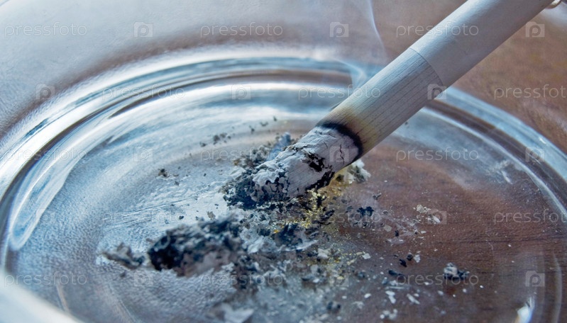 Дымящаяся сигарета в стеклянной пепельнице