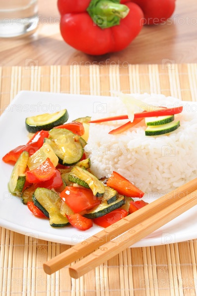 Овощной рис и палочки на тарелке