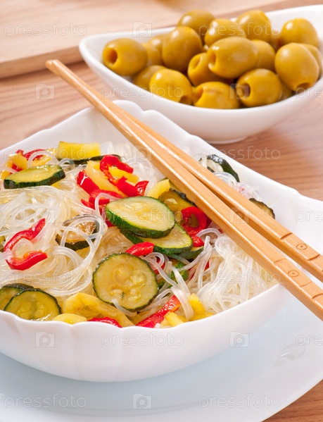 Рисовая лапша и овощи на белой тарелке